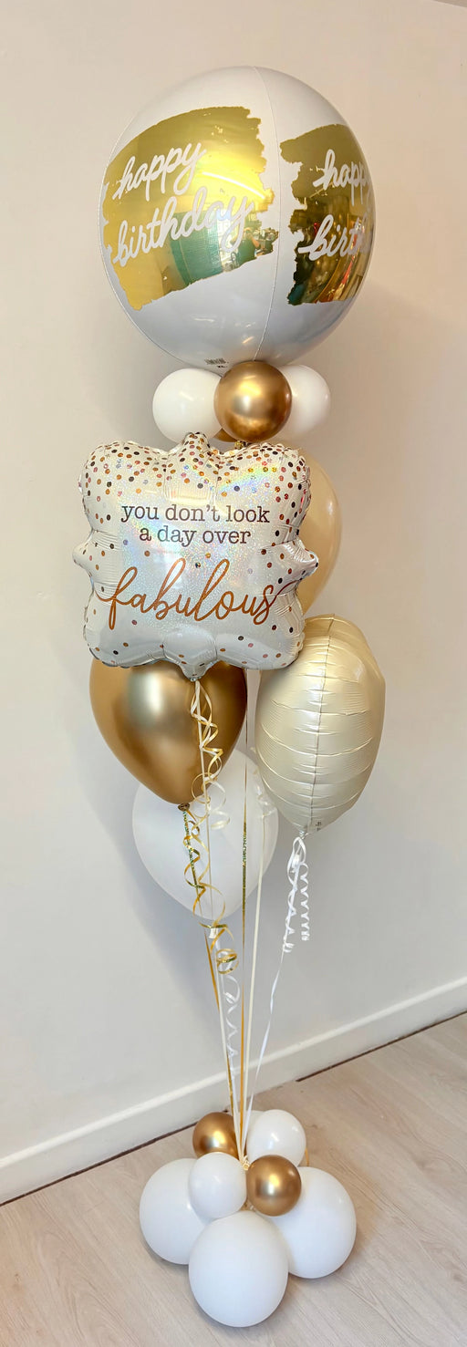 This gorgeous 50th Anniversary deluxe balloon bouquet has been created in an  array of gold and white colours incorporating an unusual orb balloon ...