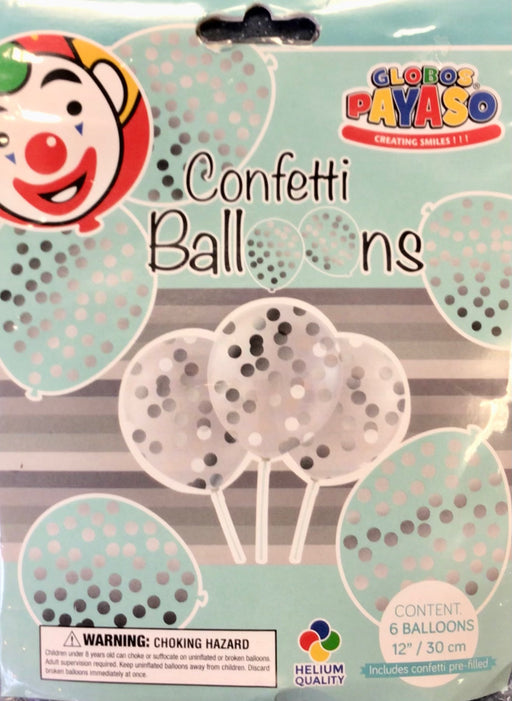 6 pack of transparent 12" latex balloons filled with silver confetti. Made of natural rubber latex.