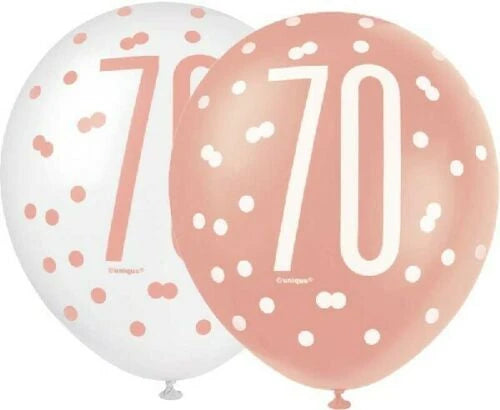 Age 70 Asst Birthday Balloons 6 Pack - Rose Gold/White