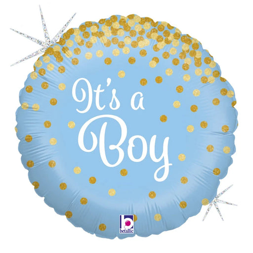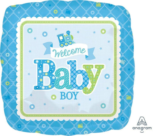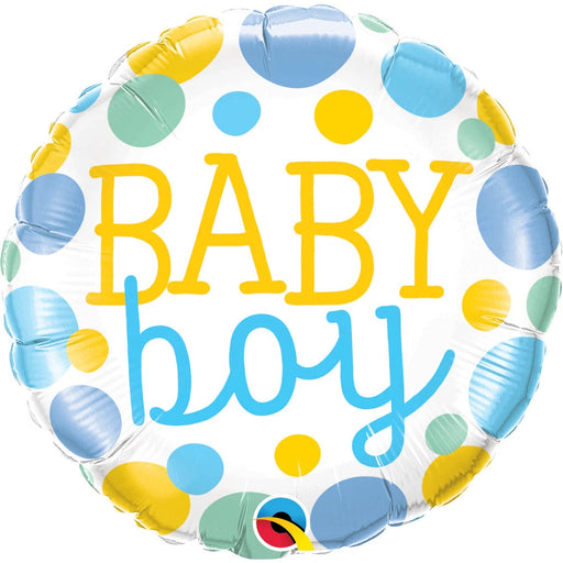 18" Foil Baby Boy Balloon In Bright Design. Can be purchased uninflated or inflated with helium in store.