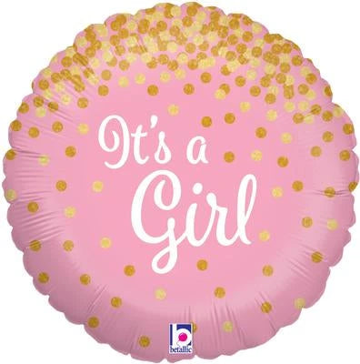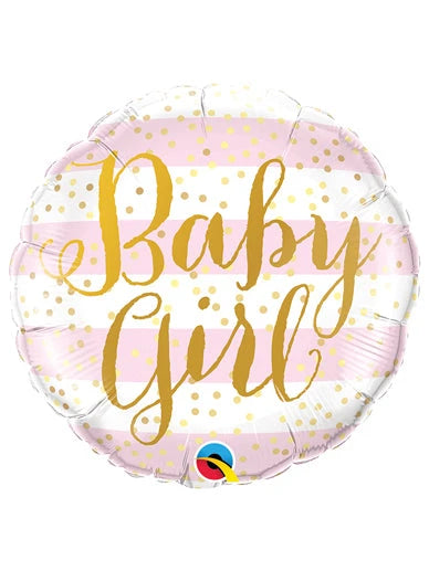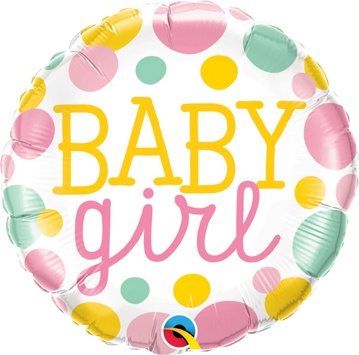 18" Foil Baby Girl Balloon In Bright Design. Can be purchased uninflated or inflated with helium in store.