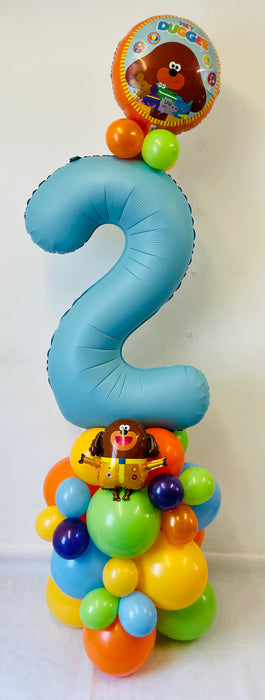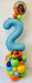 This large balloon number sits perfectly on a base of matching coloured balloons with a matching character balloon on top. The arrangement is finished off with bundles of mini balloons underneath nestled in with a mini character balloon.