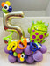 This large balloon number sits perfectly on a base of matching coloured balloons with a matching character balloon along side. The arrangement is finished off with bundles of mini balloons underneath nestled in with a mini character or shaped balloons.