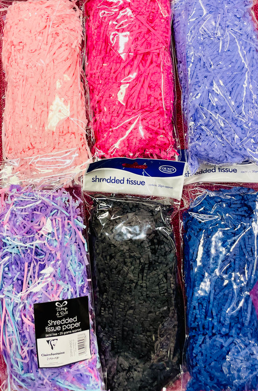 Shredded Tissue Gift Paper. Approx 20g per pack. A range of colours available - please choose from the drop down menu.