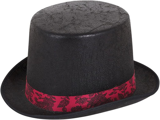 Black Satin Top Hat with a Red Ribbon Trim. One Size Fits Most. Dressing up for an olden day English theme? Add a moustache, bow tie, evening scarf...