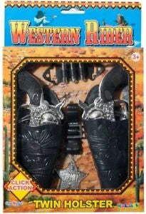 Wild West Revolver Guns In Holsters, Bullets and Sheriff Badge. Fancy Dress Novelty Item.