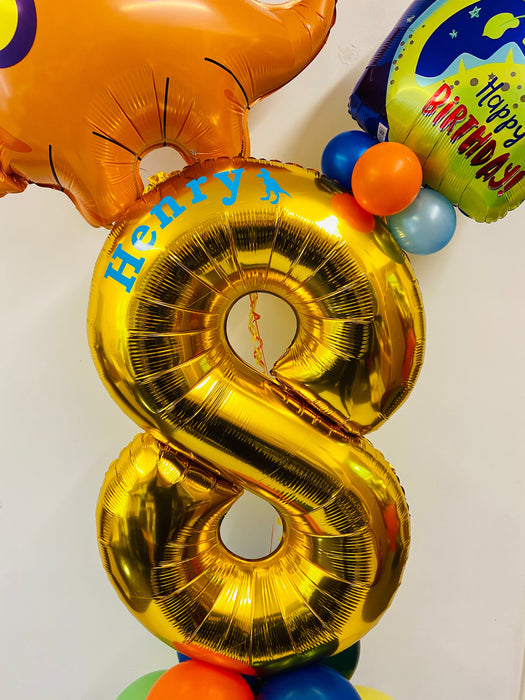 This large balloon number sits perfectly on a base of matching coloured balloons with a matching character balloon on top. The arrangement is finished off with bundles of mini balloons underneath with a Supershape foil balloon also on top.