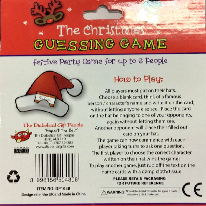 Includes 6 reusable guessing cards, 6 hats and 1 non permanent pen.