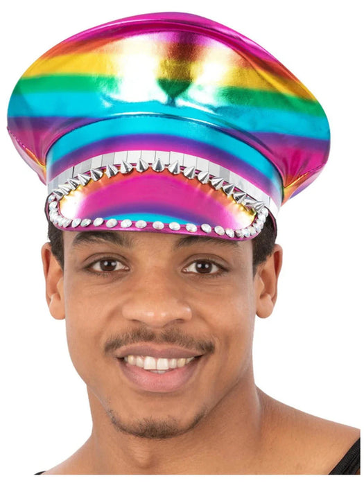 Rainbow Striped Captains Peaked Hat With Jewelled Detail.