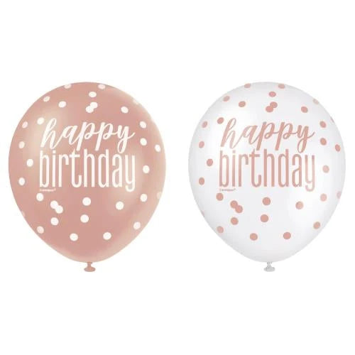 6 pack of Happy Birthday 11” Latex Balloons. Rose Gold & White Colours.