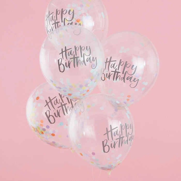 5 pack of transparent 12" latex birthday balloons filled with pastel coloured confetti.