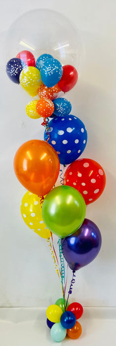 Large rainbow theme deco bubble balloon with a selection of bright and beautiful mini balloons inside. Finished off with a selection of 6 bright patterned and plain latex balloons And a pretty bubble base.